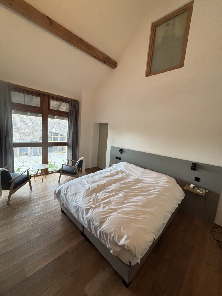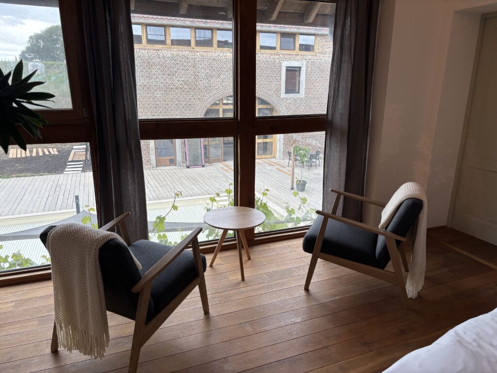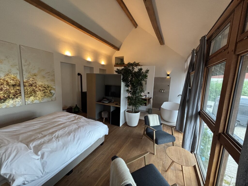 Our Chardonnay room is a large and bright rooms with floor to ceiling windows over the full width of the bed and bathroom. With its heigh ceiling and wooden beams it provides a spacious feeling throughout. The comfortable double bed with feather topper is facing small desk with a minibar. The room comes with an ensuite bathroom with a free standing bath, separate shower, toilet and sink. This room overlooks the pool area and can be connected to another double room if you would like to turn this into a large 4 person family area.